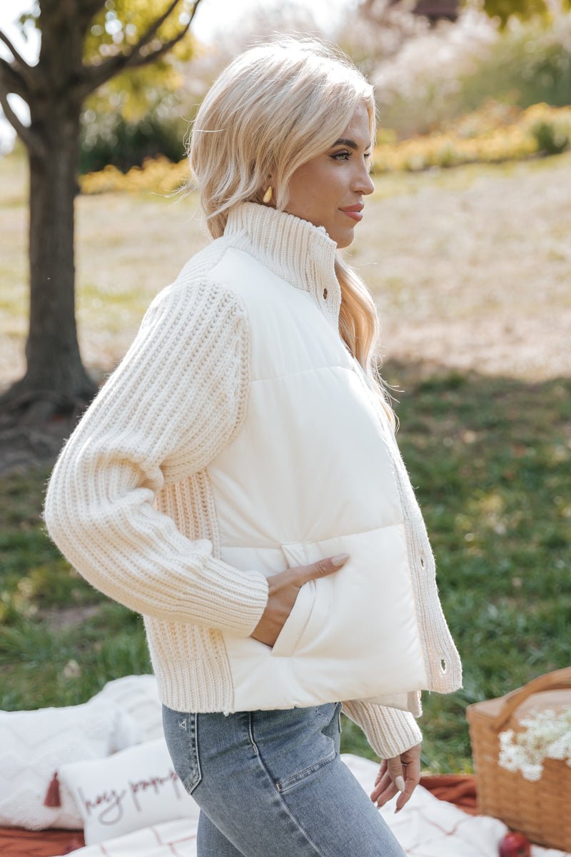 This Cream Button Down Hybrid Sweater Jacket is the perfect neutral layering piece for the fall! The sweater sleeves combined with the padded puffer material add a unique touch that is sure to elevate your overall outfit. Style it with a colored tank and then pair with denim jeans, ankle booties, and a wide brim hat for a little boho flair!