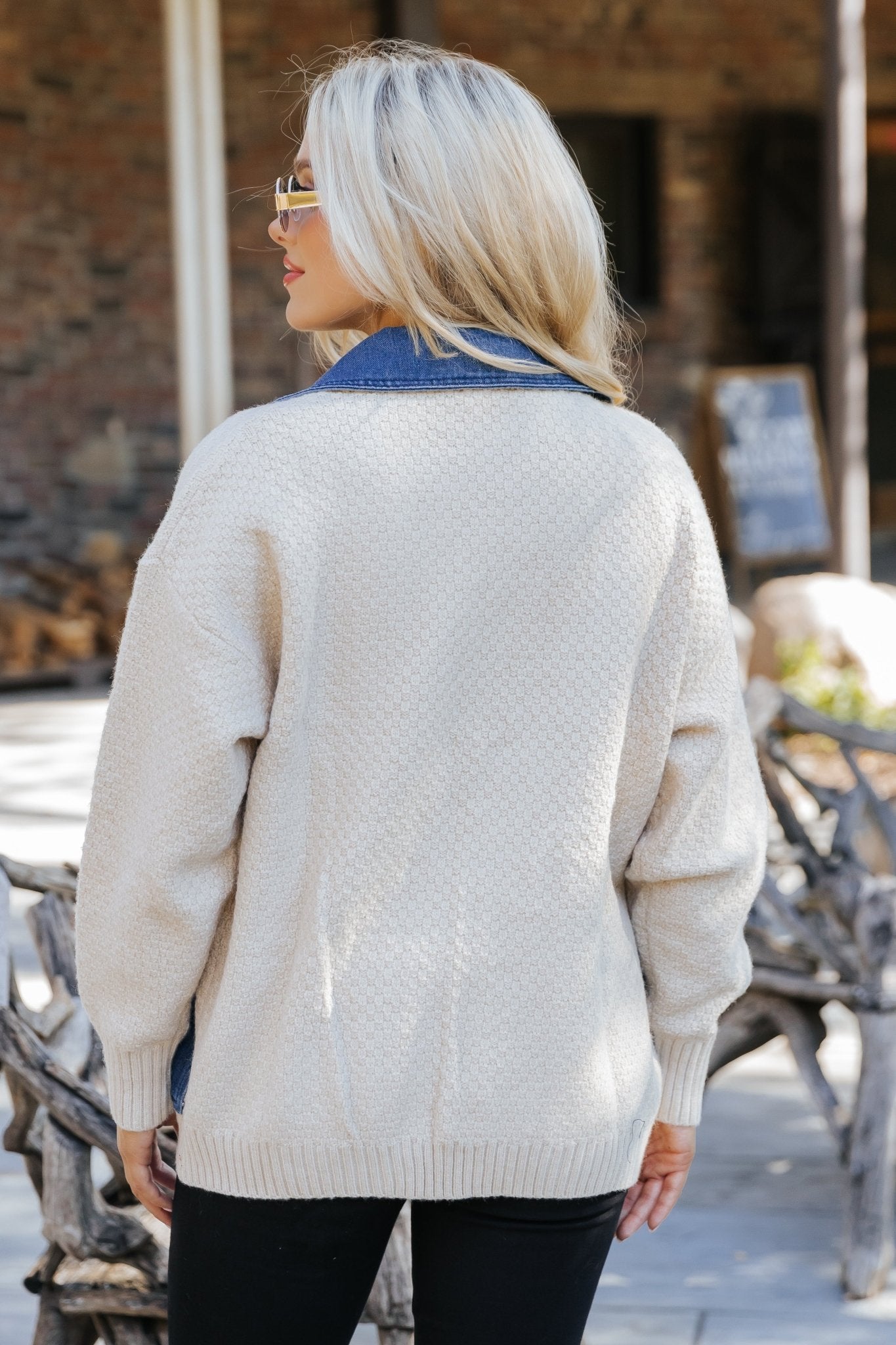 Our Beige Button Down Denim Cardigan features a classic collared neckline and ribbed cuffs for a touch of softness against the non-stretch denim material!